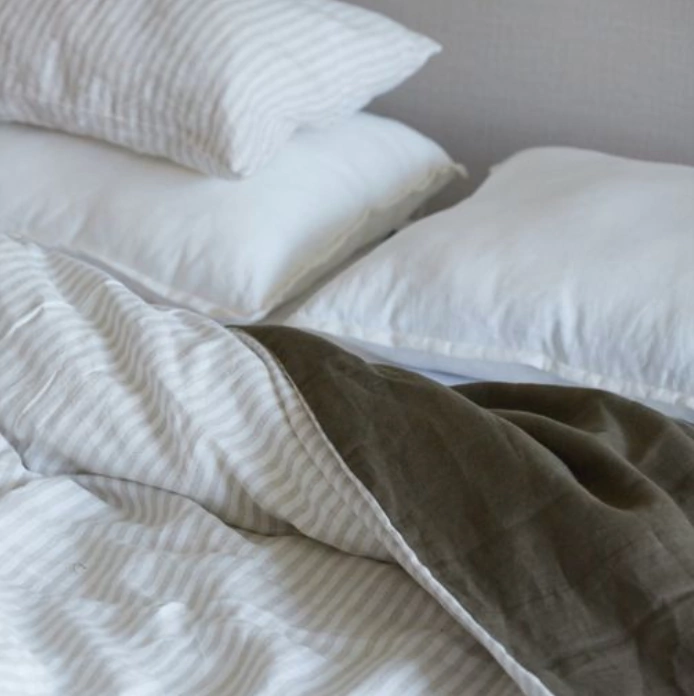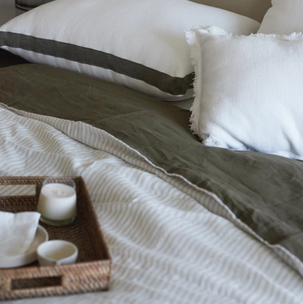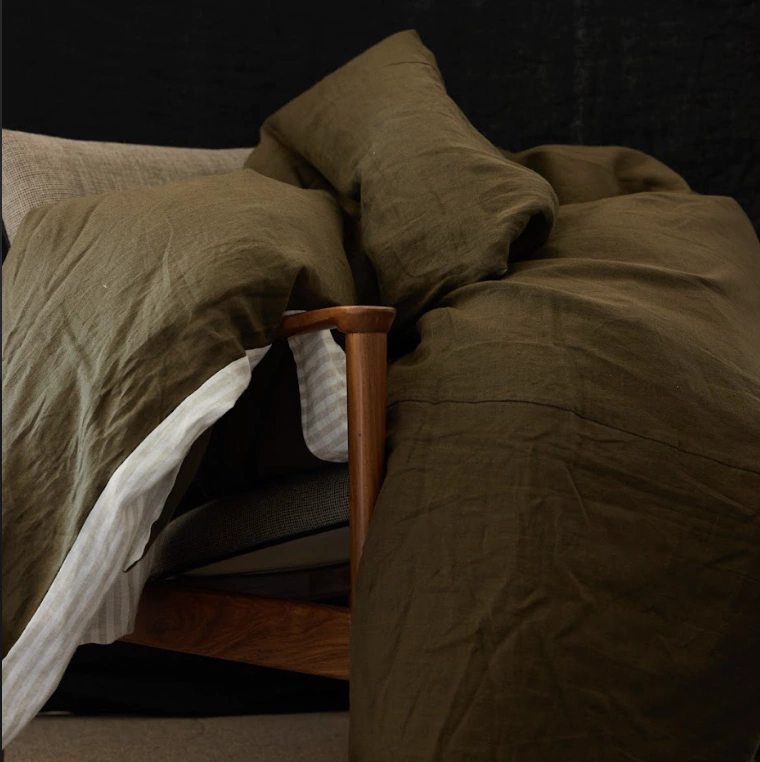 Funda para edredón hecha con nuestro Lino Catalina flax + Lino Muselina Olive. Terminación con pestaña todo alrededor y cierre en uno de los lados.