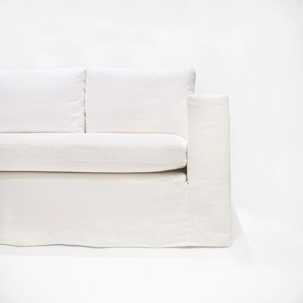 Sillón modelo Cubo. Tapizado en lienzo crudo con funda en nuestro lino Stonewash Oyster (Off White). Incluye los 3 almohadones de respaldo.